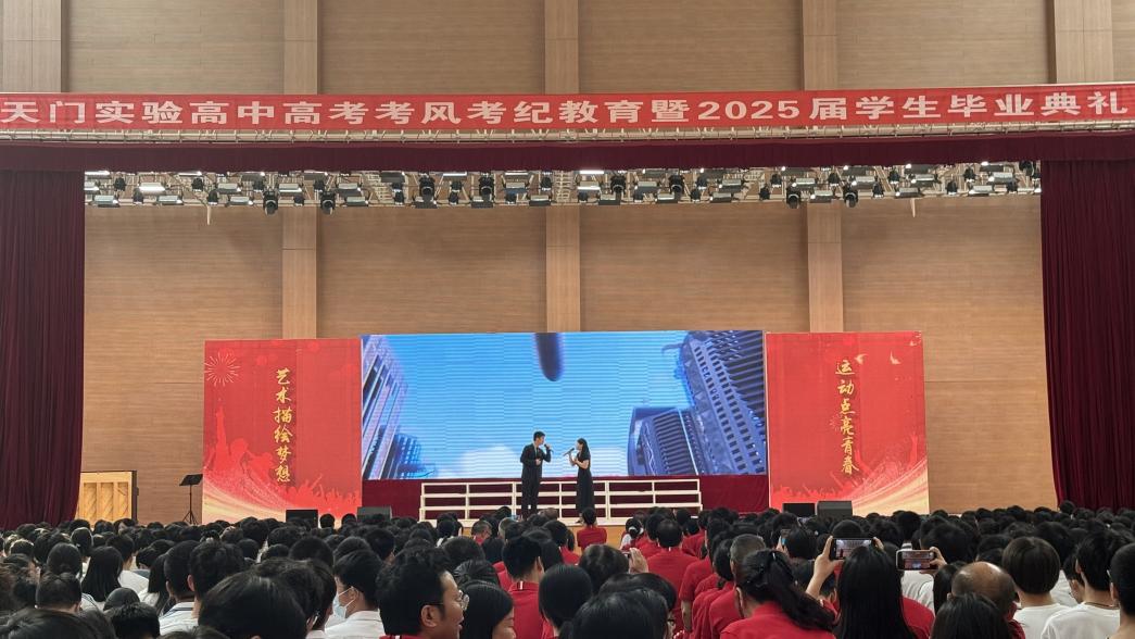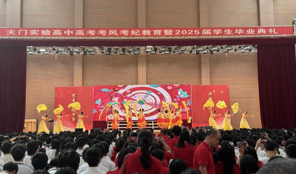 当日,天门实验高级中学毕业典礼现场气氛热烈,艺术学院精心准备了两个节目。活力四射的舞蹈《金蛇狂舞》率先登场,随后,悠扬的重唱《如愿》将现场氛围推向高潮。