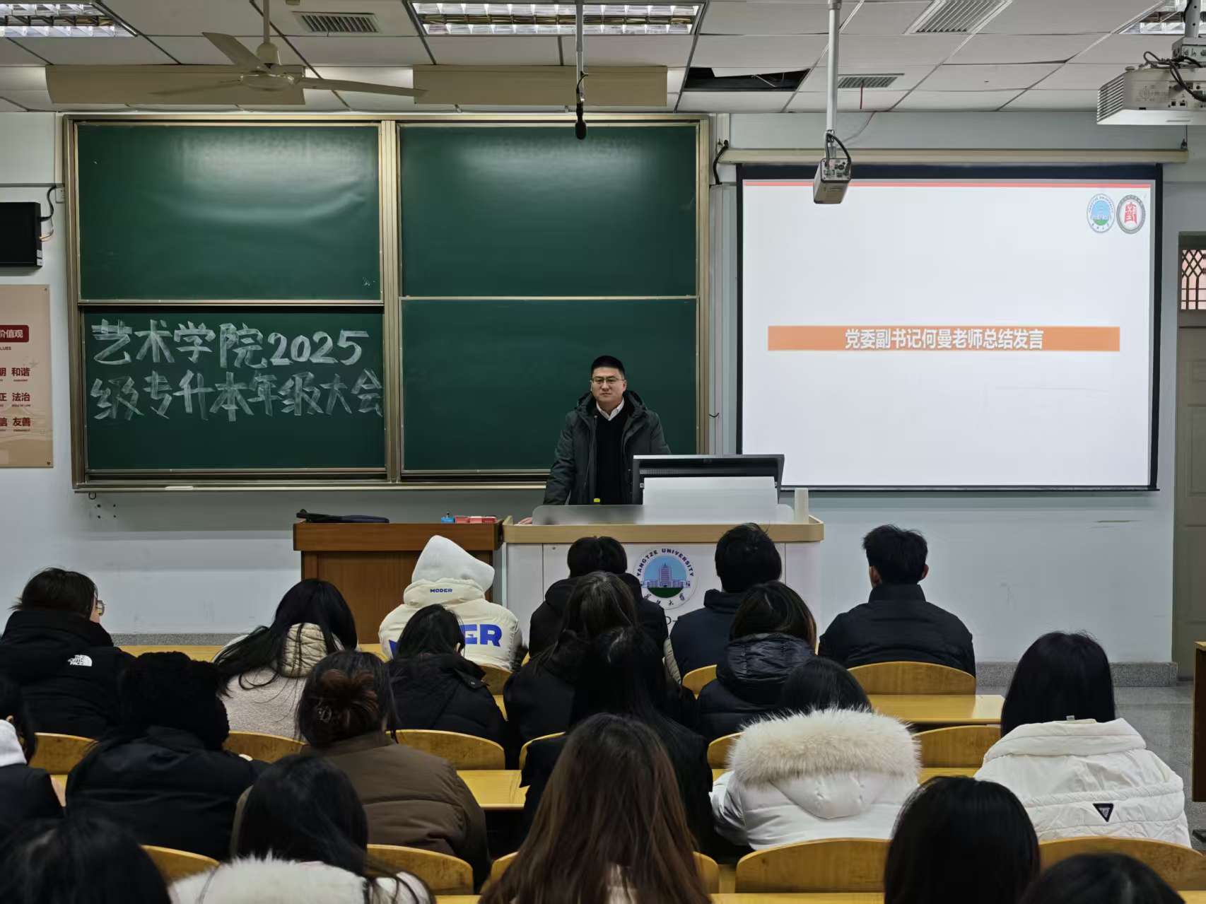 (通讯员 张慧君)为切实做好学生元旦假期安全教育与生涯规划指导工作,12月24日下午,艺术学院在12教D225教室组织召开2025级专升本年级大会。本次会议由辅导员孙岳主持,学院党委副书记何曼出席并开展考研专题辅导,2025级全体专升本学生参会。