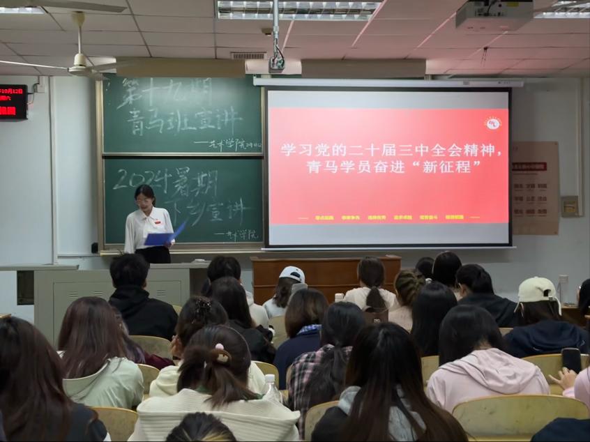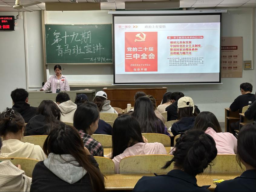 宣讲活动由第十八期青马班成员孙懿舒主持,她首先介绍了本次宣讲的重要性和主要内容。宣讲团成员围绕“学习党的二十届三中全会精神,青马学员奋进新征程”的主题,展开了深入浅出的讲解。他们结合当前国家发展形势和艺术学院的实际情况,阐述了全会精神对于青年学生的重要意义,鼓励大家将学习成果转化为实际行动,为实现中华民族伟大复兴的中国梦贡献青春力量。