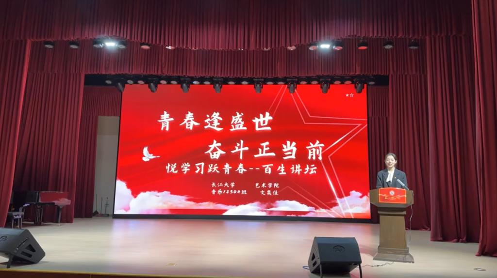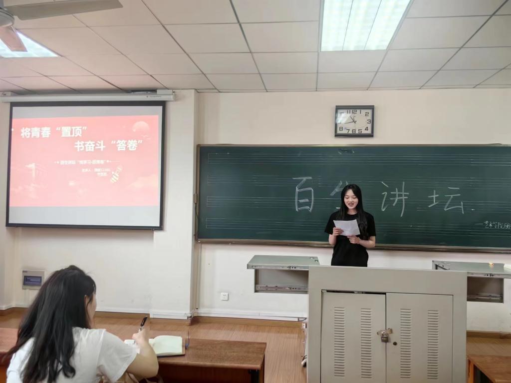 “长大青年说”——“百生讲坛”活动以演讲比赛的形式开展,以深入学习贯彻习近平新时代中国特色社会主义思想为目标,以“悦学习•跃青春”为活动主题,面向基层一线团支部广泛发动,营造了集体学习、示范宣讲、典型引领的浓厚氛围,推进“班—院—校”逐级联动。在此活动期间,相继涌现出了一大批具有思想认同,情感认同,实践认同的优秀学生,营造了以赛促学,“讲”“学”联动的友好氛围。经过层层筛选,最终推选出了一名“百生讲坛”优秀主讲人为艺术学院的代表,继续参加校级评选。