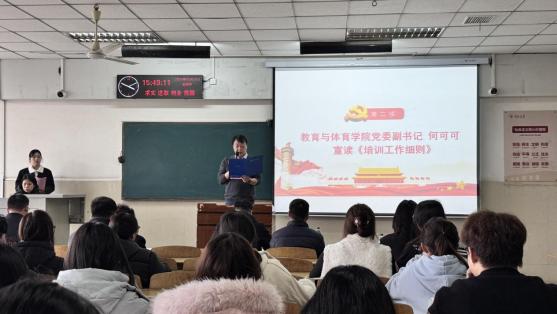 何可可宣读《第八分党校第46期培训班培训工作细则》,详细解读了课程安排、学习要求及考核标准,并着重强调全体学员需严守培训纪律、端正学习态度,以确保培训取得扎实成效。艺术学院音乐QZ251班吴彦君同学代表全体参训学员发言,她结合自身成长历程与入党初心,表达了对党组织的崇敬之情和加入党组织的坚定信念,号召全体学员珍惜此次学习机会,坚定理想信念,锤炼党性修养,以实际行动积极向党组织靠拢。